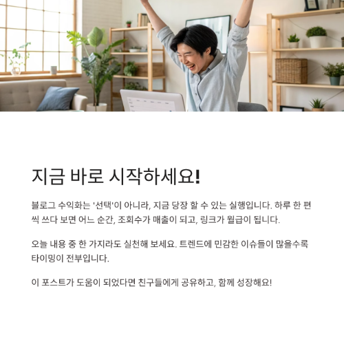 오늘 내용을 바탕으로 한 가지라도 실천해 보세요. 블로그 수익화는 ‘선택’이 아니라, 지금 당장 할 수 있는 실행입니다. 댓글이나 질문도 언제든지 환영이에요. 같이 성장해요!