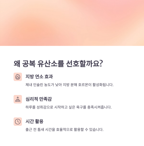 그리고 현실적으로 봤을 때도 공복 운동은 출근 전에 시간을 내기 좋아요. 커피 한 잔 마시고 가볍게 걷기만 해도 기분이 달라지니까요. ‘운동할 시간 없다’는 핑계가 통하지 않는 유일한 틈새 시간이죠.