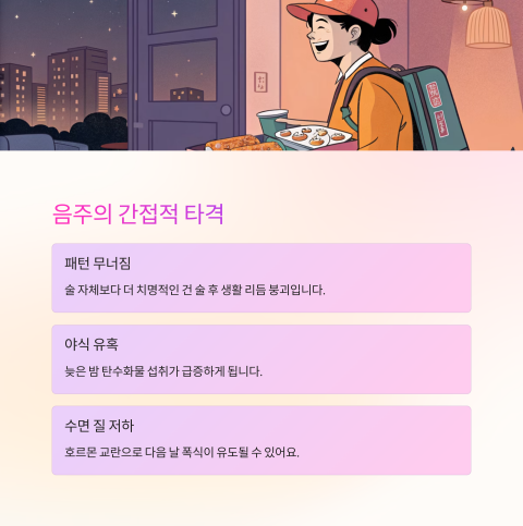 술 자체보다 더 치명적인 건 술 후 패턴의 무너짐이에요. 술을 마신 날엔 다음과 같은 행동이 나타나기 쉽습니다:
