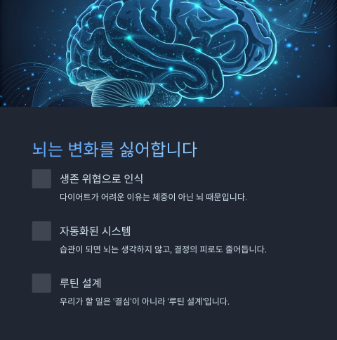 다이어트가 어려운 이유는 체중 때문이 아니라 뇌 때문이에요. 우리 뇌는 변화를 ‘생존 위협’으로 간주하기 때문에 식단을 바꾸거나 운동을 시도하면 반사적으로 저항 회로가 작동하죠. 이걸 이기는 가장 확실한 방법이 바로 ‘습관 루틴’이에요.