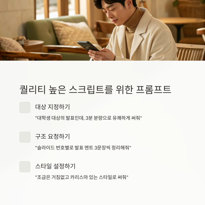 프롬프트가 핵심이에요. 발표 대상, 톤, 시간, 포인트 등을 구체적으로 말해주는 게 좋아요. “5분 분량, 초등학생 대상, 명확하고 느린 말투”라고 요청하면 훨씬 더 적절하게 작성돼요.