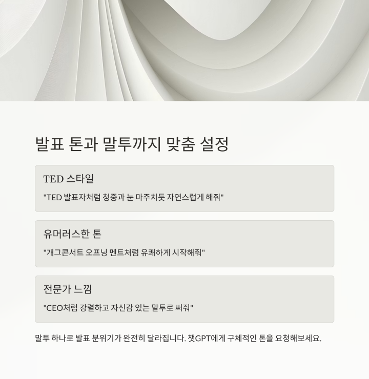 여러분, 스크립트가 아무리 완벽해도 말투 하나에 발표 분위기가 확 달라지는 거 아시죠? 예를 들어 같은 내용을 말하더라도 ‘선생님처럼 조곤조곤’할 수도 있고, ‘CEO처럼 강렬하게’ 전달할 수도 있어요. 저는 챗GPT에게 말투까지 설정해 달라고 요청해요. 그리고 이게 진짜 신의 한 수였습니다.