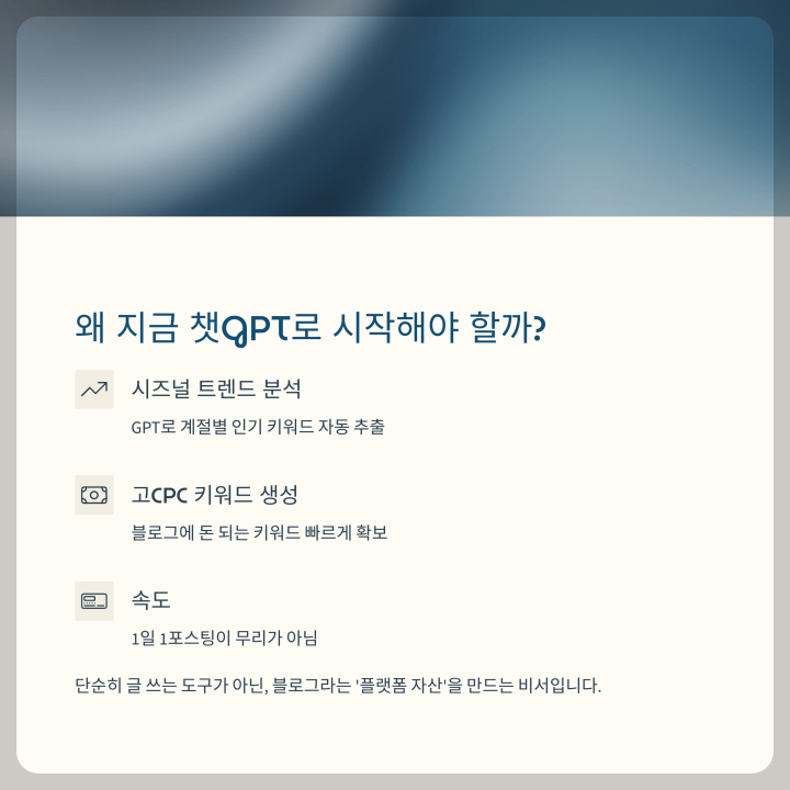 무엇보다 중요한 건 GPT를 수익형 마인드로 써야 한다는 거예요. 단순히 블로그 글 써주는 도구가 아니라, 블로그라는 ‘플랫폼 자산’을 만드는 비서라고 생각해 보세요.
