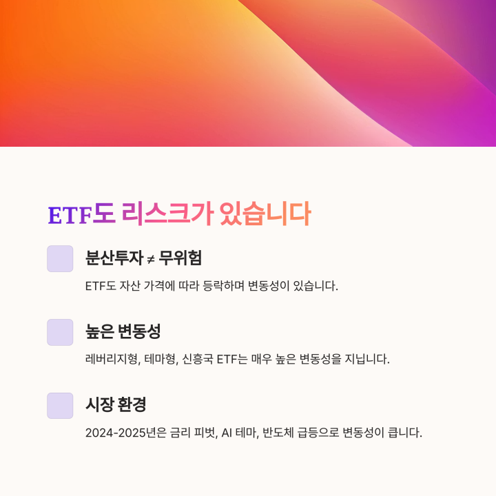 ETF는 여러 종목에 분산 투자되는 상품이라서 안전하다는 인식이 강해요. 실제로도 개별 종목 대비 리스크가 낮은 건 맞습니다. 하지만 ETF 역시 자산 가격에 따라 등락하며, 특히 레버리지형·테마형·신흥국 ETF는 매우 높은 변동성을 지닙니다. 게다가 2024~2025년은 글로벌 금리 피벗 전환기, 인공지능 테마, 반도체 섹터 급등 등 매우 변동성 높은 이슈들이 얽혀 있는 시기입니다. ETF라고 해도 리스크를 예외로 생각해선 안 됩니다.