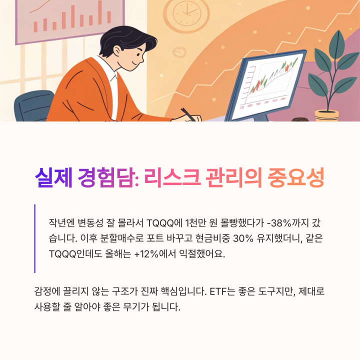 작년엔 변동성 잘 몰라서 TQQQ에 1천만 원 몰빵 했다가 -38%까지 갔습니다. 이후 분할매수로 포트 바꾸고 현금비중 30% 유지했더니, 같은 TQQQ인데도 올해는 +12%에서 익절 했어요. 감정에 끌리지 않는 구조가 진짜 핵심입니다.