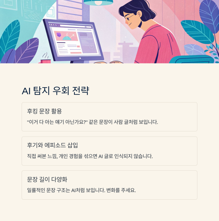 - AI 콘텐츠 탐지기 기준 우회 (단순 요약형 문장 피하기)